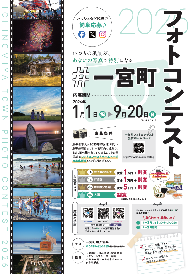 (2)投稿の際、ハッシュタグ「#一宮町フォトコンテスト2026」「#一宮町観光」の2つを必須タグとし、写真を投稿してください。